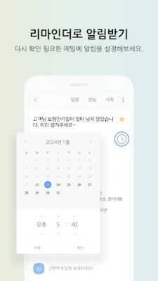 회의 일정 메일, 예약 메일 등 다시 확인이 필요한 메일에 알람을 설정하고 노티를 받아보세요.
