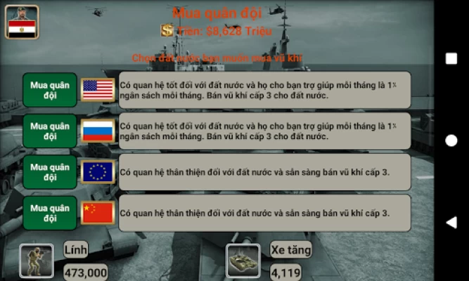 Dẫn dắt quân đội của bạn với binh sĩ, xe tăng, pháo binh, tên lửa phòng không, trực thăng, máy bay chiến đấu đa nhiệm, tàu chiến, tàu ngầm và tên lửa đạn đạo.