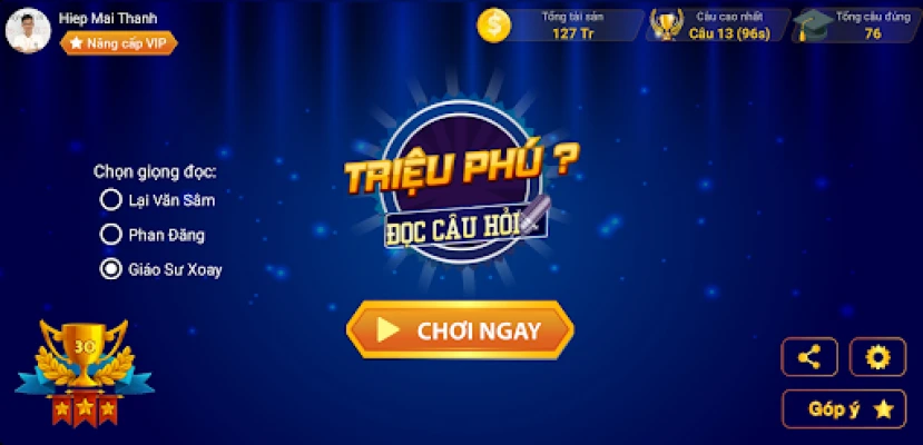 ✔ Lưu thành tích của người chơi theo tổng tiền nhận được, mốc câu hỏi cao nhất, tổng số câu đã vượt qua, thời gian trả lời các câu hỏi
