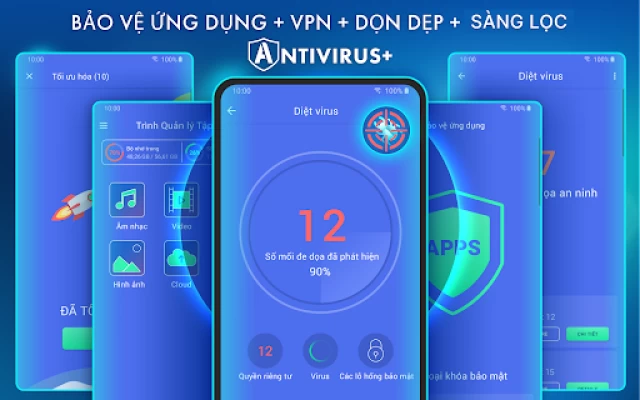 Bảo vệ thiết bị trước sự tấn công của hacker. Phần mềm chống vi-rút sẽ quét, phát hiện và xóa vi-rút trên thiết bị của bạn. Bảo vệ thiết bị chống lại tất cả các mối đe dọa tiềm ẩn: vi-rút, trojan, phần mềm độc hại, phần mềm gián điệp và phần mềm quảng cáo.