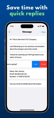 Stop typing the same message again and again. Create and save quick replies in our app for your most used messages and send them with a single tap on WhatsApp, WhatsApp Business or SMS next time you need them.