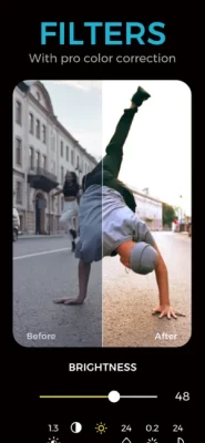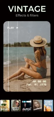 - Endless variety of video effects and camera filters including Retro, Vintage, Chromatic, glitch, distortions, mirrors, VHS, beautify, blends, collages, duo-tone and pixel effects.