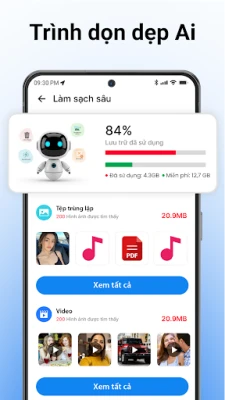 Phone cleaner có tính năng dọn dẹp AI thông minh hoạt động như một trình dọn dẹp lưu trữ. Thuật toán AI tiên tiến của ứng dụng này có thể phát hiện và quét dữ liệu không cần thiết. Dữ liệu này bao gồm ảnh và tệp trùng lặp, ảnh chụp màn hình cũ, tệp lớn, v.v. AI cleaner quét và liệt kê dữ liệu trước mặt người dùng có thể dọn dẹp. Người dùng có thể dễ dàng dọn dẹp ảnh và tệp trùng lặp và dữ liệu không cần thiết khác.