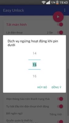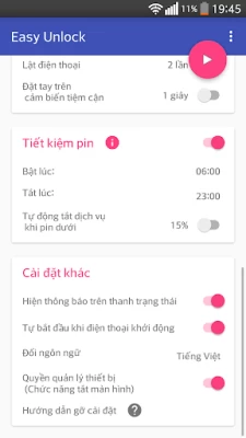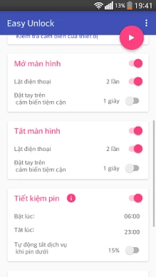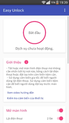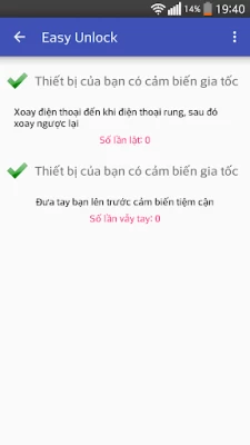 Tắt màn hình, mở khóa màn hình thật dễ dàng với Easy Unlock. Bình thường khi sử dụng điện thoại, bạn phải tắt màn hình bằng nút nguồn và theo thời gian sử dụng thì nút nguồn của bạn sẽ có thể bị trờn. Hãy sử dụng tính năng các tính năng Vẫy tay mở khóa, lật để khóa, lắc mở khóa...
