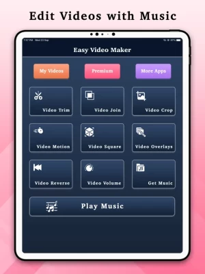 App Features:- - Video Trim - Video Join - Video Crop - Video Motion - Video Square - Video Overlays - Video Reverse - Video Volume - Add Music Over Video - Play Music From App