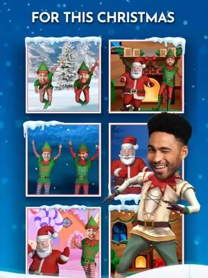 Select the best dance theme and get ready to do the traditional elf dance with Santa Claus or the Elves. Bring joy and live the Christmas spirit. Put your face on a 3D model. Place it onto the elf or Santa Claus. Discover various funny dances. Select between 10 original backgrounds. Record your character dancing and share it.