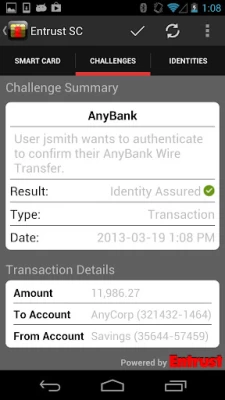 The Entrust IdentityGuard Mobile Smart Credential provides an innovative yet relevant authentication solution and is deployed on the IdentityGuard enterprise authentication platform. IdentityGuard’s comprehensive capabilities are designed to meet authentication needs across your organization including embedded support for diverse user group needs, cloud security, mobile security, and adaptive authentication all on a platform with unmatched deployment flexibility and agility.