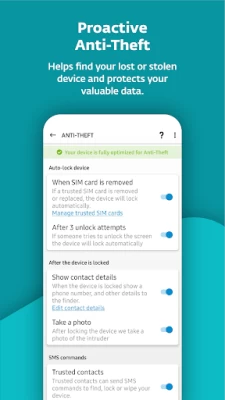• Anti-Theft: Khóa, theo dõi và xóa sạch thiết bị nếu thiết bị bị mất hoặc bị đánh cắp.
