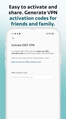 ESET VPN yêu cầu mã kích hoạt VPN. Với đăng ký ESET HOME Security Ultimate, bạn có thể dễ dàng tạo các mã kích hoạt VPN trên trang web ESET HOME. Kích hoạt VPN cho tối đa 10 thiết bị cho mỗi đăng ký và chia sẻ những mã này với bạn bè và gia đình—họ không bắt buộc phải có đăng ký hoặc tài khoản ESET HOME.