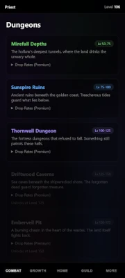 Pick from five classes — Knight, Wizard, Archer, Assassin, or Priest. Each has unique skills, gear, and playstyle. Build around stats, rune combos, artifacts, enchanting, and crafting to shape your perfect setup.