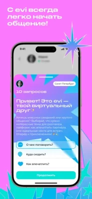 Запомните: Evi — это не просто приложение для знакомств. Это ваш надёжный партнёр в мире отношений, который всегда на стороне. Мы уверены, что с нами вы сможете найти не только романтические связи, но и настоящую дружбу. Самое время проявить свою яркую индивидуальность! Скачивайте Evi и начинайте знакомиться уже сегодня!