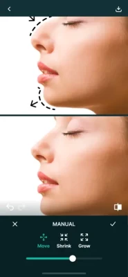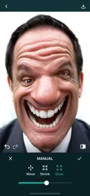 • Use your finger to drag or shrink the body parts that you want distorted. For example you can crush this bump on your nose, or even make you slimmer.