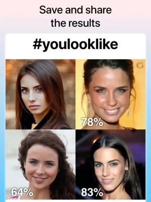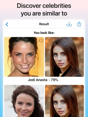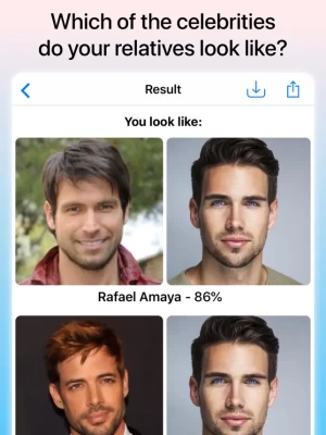 Take a photo or upload it from the Gallery to see the result: 3 celebrities which you look like and similarity percentage for each one.
