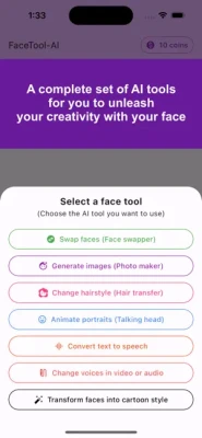 It's time to refresh your social media content and surprise your friends. This app helps you replace any face in a photo or video with your own, generate professional portrait photos and themed headshots, create a funny talking head or make your avatar sing a song, change any voice from audio or video with your voice, and turn your face into any cartoon style. And many other AI tools can help you satisfy your creative purposes.