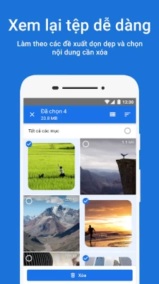 Dễ dàng xem mức dung lượng còn lại trên thiết bị, thẻ SD và ổ đĩa USB. Giải phóng dung lượng bằng cách tìm ảnh cũ từ ứng dụng nhắn tin, tệp trùng lặp, xoá bộ nhớ đệm và nhiều thao tác khác.