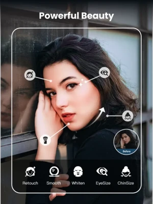 - Beautify: retouch, smooth, whiten, adjust skin tone, eye size and chin size, eliminate red-eye