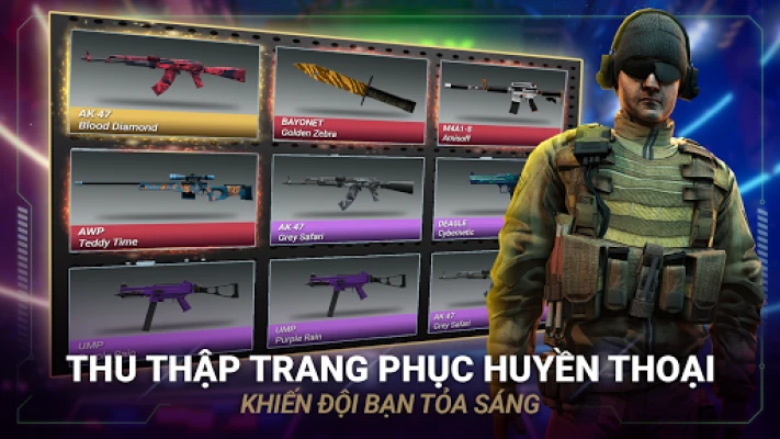 Tùy chỉnh trang bị và thể hiện các skin vũ khí, nhân vật và sticker huyền thoại và hoành tráng khiến đối thủ ghen tị. Khi bạn chơi, bạn sẽ mở khóa các hòm skin lớn và tốt hơn giúp bạn có người chơi trông như chuyên nghiệp.