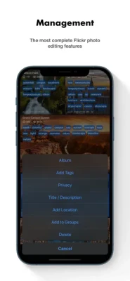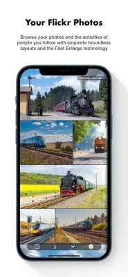 You can click a photo in the photostream to directly stretch the entire photostream to enlarge the photo. This makes the speed of browsing photos has been dramatically increased, it can be more than 4 times faster than the official "Flickr" app, and more than 3 times faster than the iOS 14 "Photos" app, and it is more aesthetic.