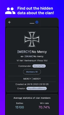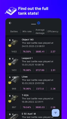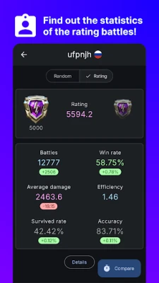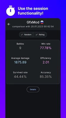 - Save session statistics and easily compare it with the current one - View account statistics from any of the WoT/Tanks Blitz regions - View detailed statistics of random fights - View detailed statistics of rating fights - View detailed information about the clan, including the terms of auto-recruiting - View detailed equipment statistics