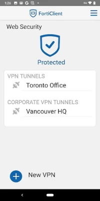 FortiClient - The Security Fabric Agent App provides endpoint security & visibility into the Fortinet fabric. It also allows you to securely connect your roaming mobile device to corporate network (over IPSEC or SSL VPN). Web Security feature helps protect your phone or tablet from malicious websites and unwanted web content. When using Virtual Private Network (VPN) connection between your Android device and FortiGate, all device traffic will be fully encrypted and sent over the secure tunnel.