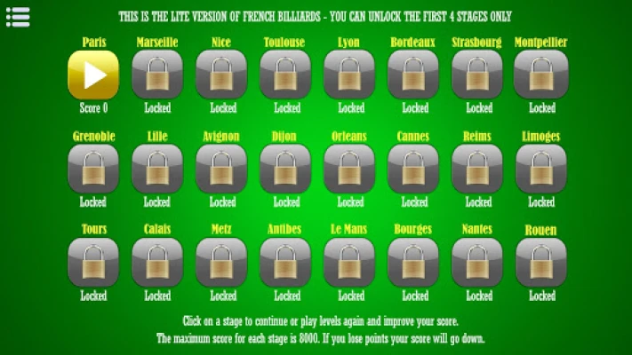 Play classic French billiards and collect extra stars and bonus points for hitting cushions before a carambola. The aim is to hit the red ball and the yellow ball with the white ball. If you hit cushions before hitting the two balls you earn extra points and stars.