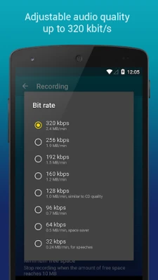 Cài đặt Chất lượng. Tùy chỉnh chất lượng âm thanh với bit rate lên tới 320 kbps. Bạn có thể ghi âm file dưới định dạng WAV, OGG, M4A, và FLAC (thử nghiệm).