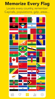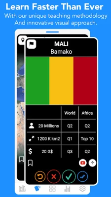 You'll quickly be able to identify flags, locate countries on the map, memorize capitals, and learn interesting statistics such as population, GDP, and size of every country around the world. It’s up to you to decide if you want to memorize precise numbers or just an order of magnitude or a ranking. Our app covers all 7 continents and every country around the world. But you can also choose to focus on a specific country and memorize all 50 USA states.