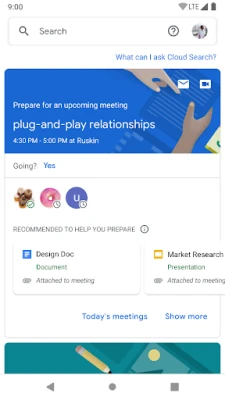 Sử dụng nguồn lực của Google để tìm kiếm trên nội dung của công ty trong G Suite. Từ Gmail và Drive cho đến Tài liệu, Trang tính, Trang trình bày, Lịch, v.v, Google Cloud Search trả lời các câu hỏi của bạn và đưa ra những đề xuất chủ động để giúp bạn trong suốt cả ngày.