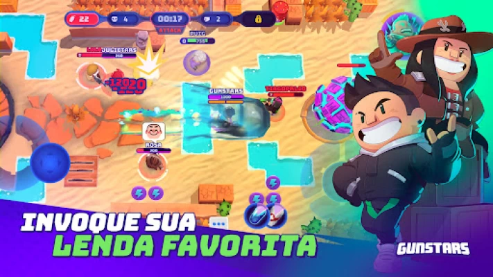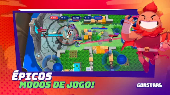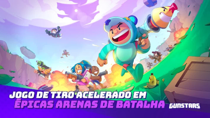 Um jogo de tiro multiplayer feito para celular! Jogue sozinho ou convide amigos e viva experiências épicas nas arenas de batalha do universo Gunstars.