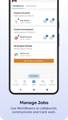 Once you and the Employer agree on the payment terms and the project scope, create an online agreement to start work. Use Guru WorkRooms to keep track of projects, collaborate with team members, and communicate with Employers.