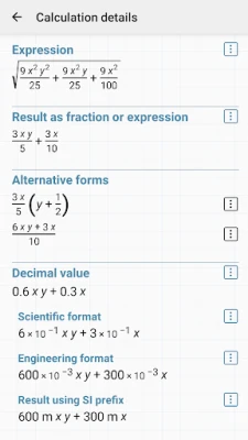 - calculation details - extended information about a calculation like all complex roots, unit circle etc.;