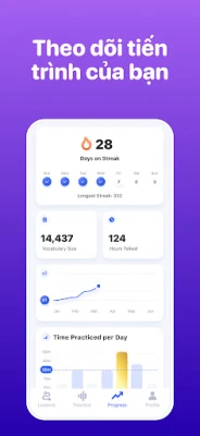 Theo dõi mức độ thành thạo – Xem tiến trình thực tế qua số liệu nói, chuỗi ngày học và thử thách trong ứng dụng.