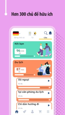 • 5.000 câu tiếng Đức (thường được sử dụng): câu quan trọng nhất cho các cuộc hội thoại hàng ngày và du lịch, được phân loại thành 10 cấp độ và 120 chủ đề.