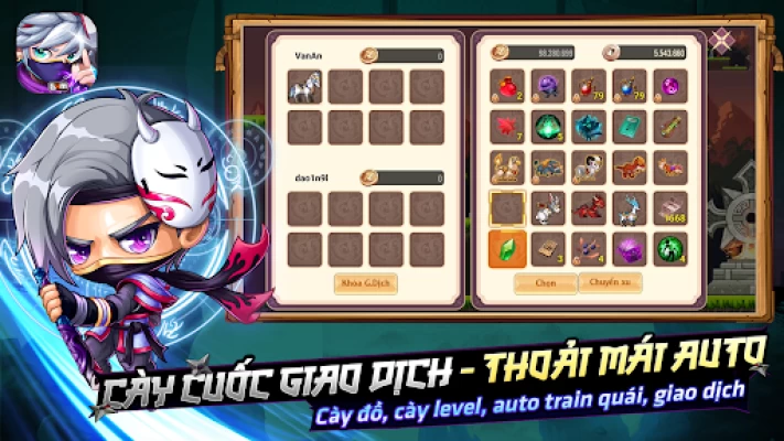 - Cày đồ, cày level, auto tốc biến, auto train quái, giao dịch, bày bán trên chợ..!? Đặc biệt, bạn còn một fan trung thành của dòng game nhập vai 2D chibi, chuyên cày cuốc thì game luôn sẵn sàng đáp ứng được hết nguyện vọng ấy.
