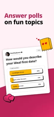 It’s a poll-based dating app designed to help you make friends who think like you. Answer a variety of polls on fun topics, show off your rizz and let the app's AI match you with your like-minded fam who shares the same thoughts and opinions as you. Hunch gives you a match score based on your answers to polls, helping you find people who really get you because you both think like each other. Be your authentic self, answer polls honestly, and chat with strangers. Hunch helps you easily talk to strangers and chat online with people who like the same things you do.