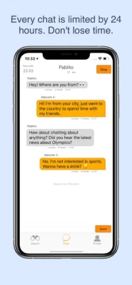 Every chat is limited by 24 hours. Don't lose time. Find hot topics to discuss and make friends before time is over.
