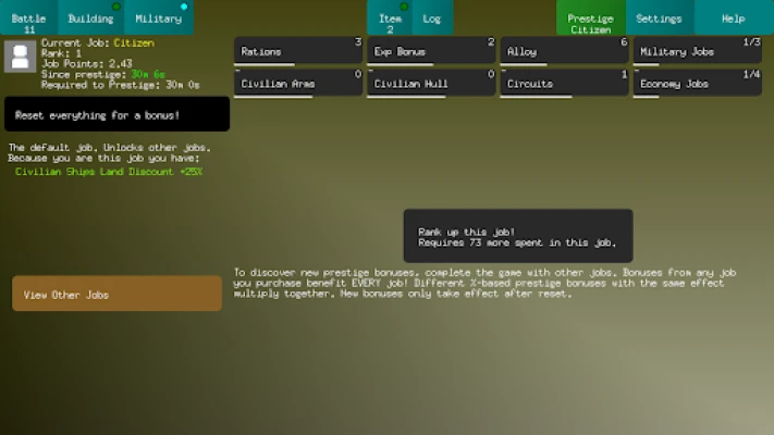 - 84 Prestige bonuses spread across 7 Jobs - 11 Ship Types - 32 Buildings - 21 Collectable Items - 8 "Insight" Upgrades - 5 "Science" Upgrades - This game is growing!