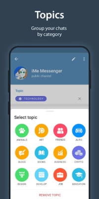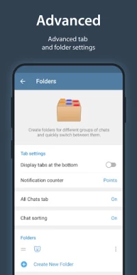 • Topics and folders for grouping chats;