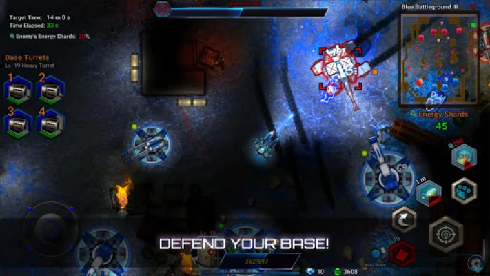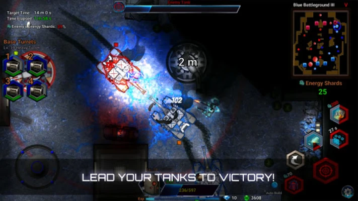 These two options can be used jointly, for example, joystick for movement with tap-to-target. Target an enemy and shooting will be automated. The main challenge is to actively dodge incoming projectiles and avoid other threats in real time, while destroying enemy tanks and turrets.