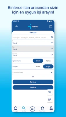 • İlan Arama: Pozisyon, il/ilçe, meslek, işyeri türü (kamu/özel), engelli durumu, çalışma şekli (tam/kısmi zamanlı, vardiya), ilan tarihi, ilan no, öğrenim durumu, işyeri unvanı vb. parametrelerle detaylı arama