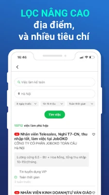 Cho phép lọc, tìm việc làm với nhiều tiêu chí khác nhau: Địa điểm, mức lương, ngành nghề, cấp bậc,