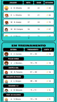 Sistema de treino detalhado: programe rotina diária para velocidade, técnica, força, passes, chutes e visão de jogo. Ajuste intensidade para evitar contusões.