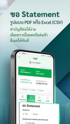 ดูรายการเดินบัญชีย้อนหลังได้ 12 เดือน ทั้งภาษาไทยหรือภาษาอังกฤษ เลือกดาวน์โหลดไฟล์ได้ทั้ง PDF/CSV หรือจะส่งเข้าอีเมลได้เพื่อการใช้งานและการวิเคราะห์เพิ่มเติมได้สะดวก รวดเร็ว