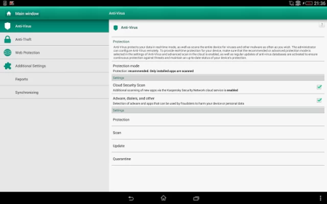 • Anti-malware protection supported by cloud-assisted intelligence—Detects and neutralizes threats on your phone or tablet using anti-virus databases and the Kaspersky Security Network cloud service. Protects your mobile device against threats, viruses, and other malicious applications in real time —automatically blocking malware and more