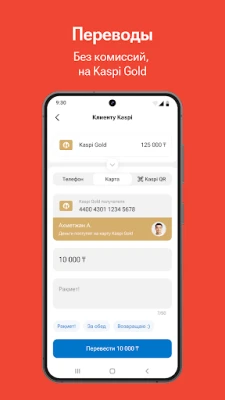 • Переводы без комиссий на любую Kaspi Gold и на Kaspi Gold с других карт любого банка