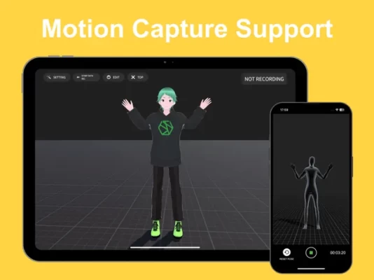 You can capture motion by using camera and using mocopi. Motion data can be saved and managed. If you prepare multiple mocopi, you can record data of multiple people at the same time. (up to 3 units)