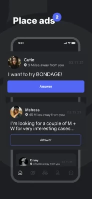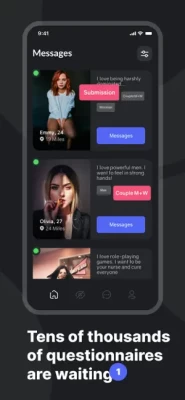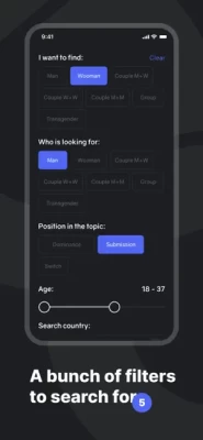Only real peaple, no bots or fake profiles. Filter users by bdsm roles, such as dominant, mistress, etc. Free messages.