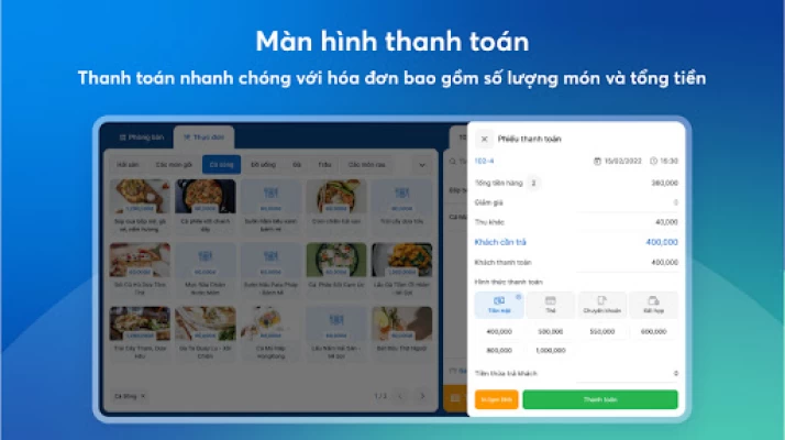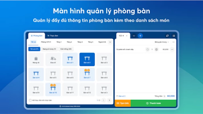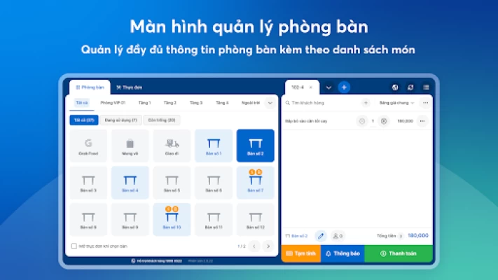 Hiển thị hóa đơn của từng bàn với số món và tổng tiền chính xác, giúp nhân viên thu ngân tiến hành thanh toán nhanh, khách hài lòng