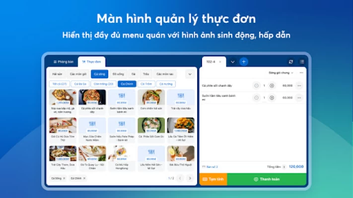 Toàn bộ menu của quán được hiển thị đầy đủ, chi tiết trên màn hình máy POS TOUCH như tên món, giá thành, hình ảnh minh họa món giúp khách hàng dễ dàng lựa chọn