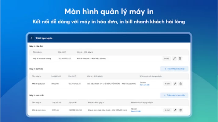 Kết nối dễ dàng với máy in hóa đơn, giúp in bill nhanh chóng chưa đến 1 giây. Gia tăng sự chuyên nghiệp và uy tín cho quán của bạn.